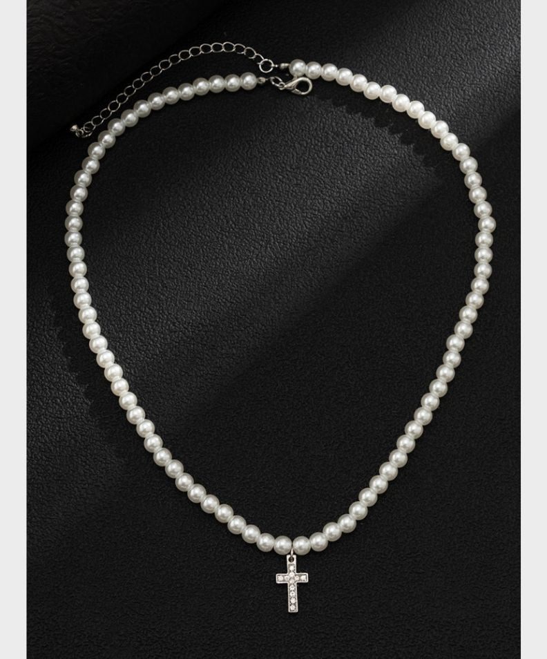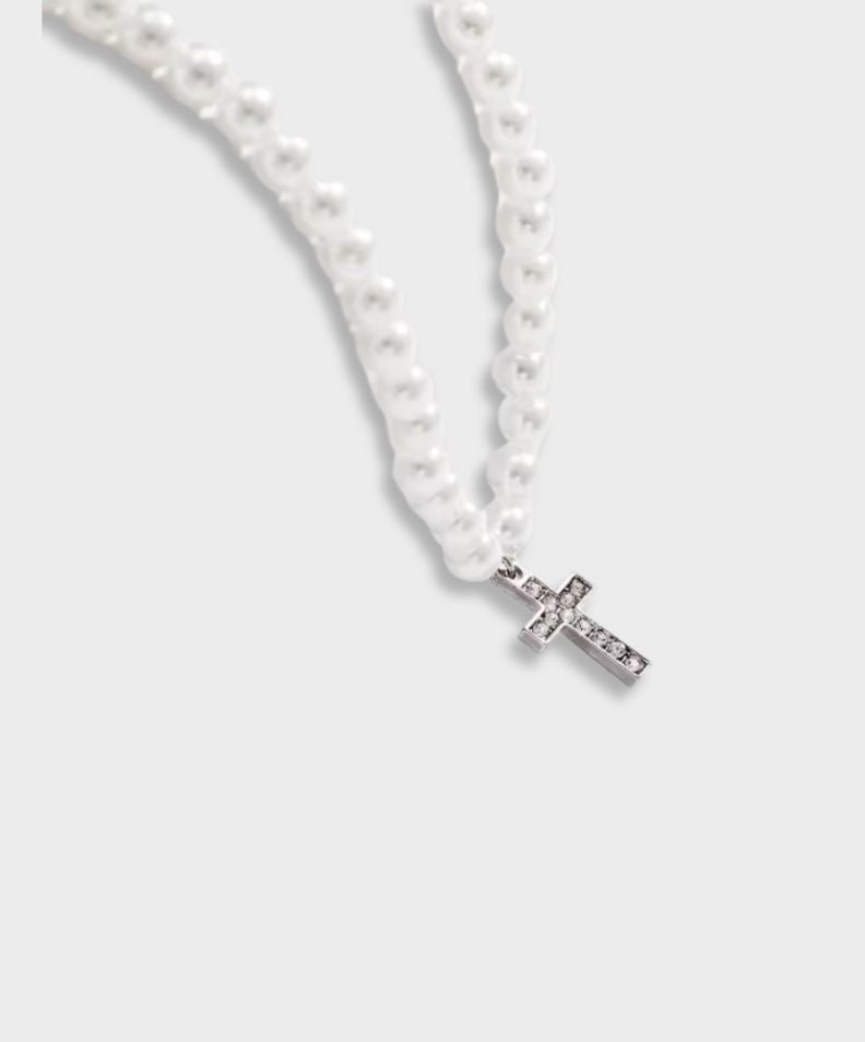 Une touche moderne d'élégance : des perles simulées rehaussées d'un pendentif minimaliste en forme de croix.