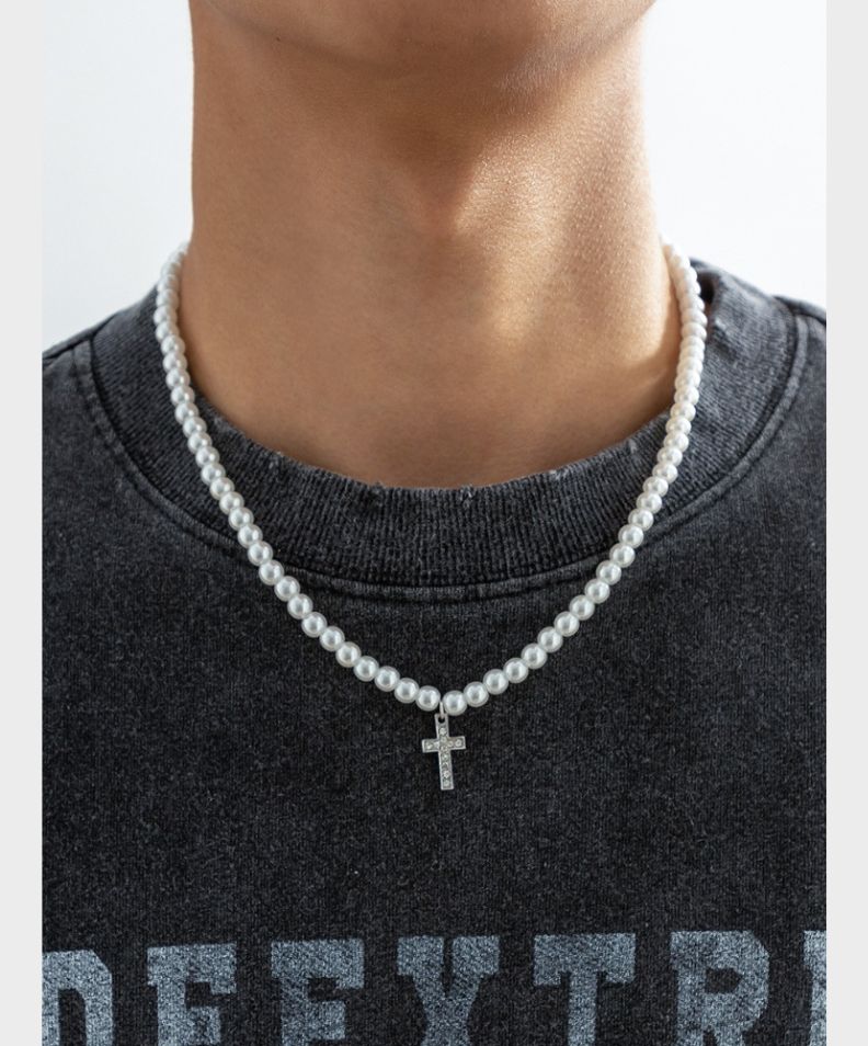 Des perles rondes classiques simulées associées à une croix élégante de 2 cm : un style intemporel avec une touche audacieuse.