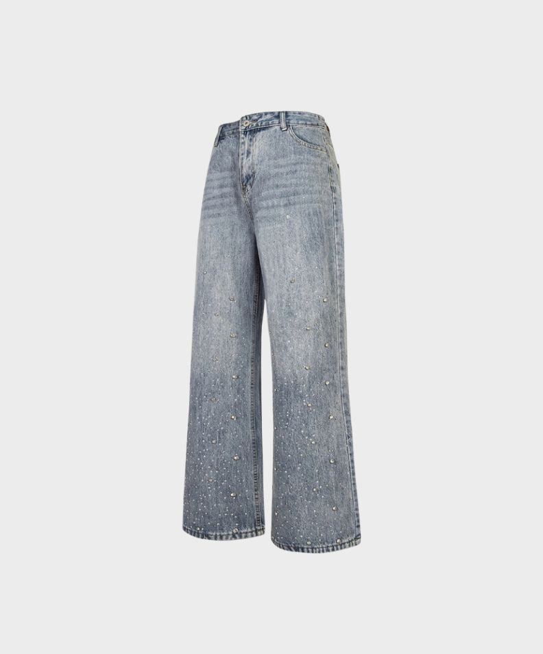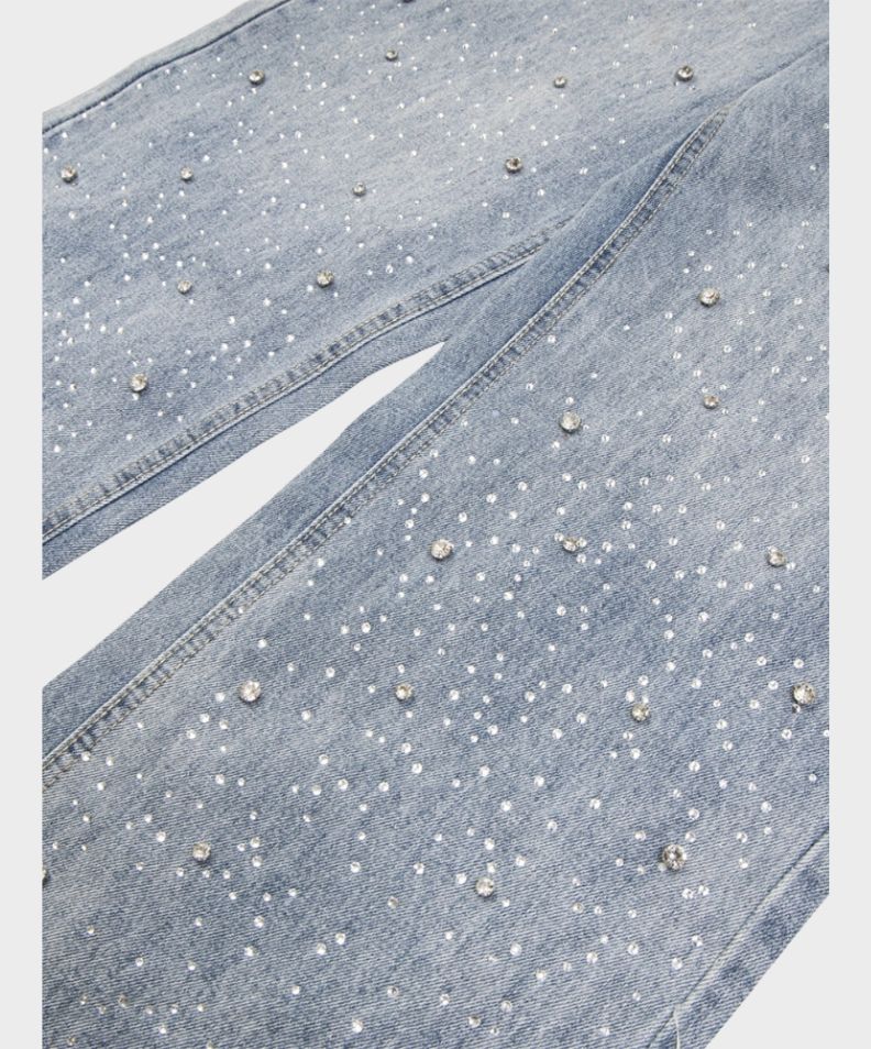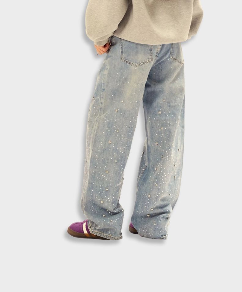 Ce jean baggy en denim est orné de strass sur toute sa surface pour un look audacieux.