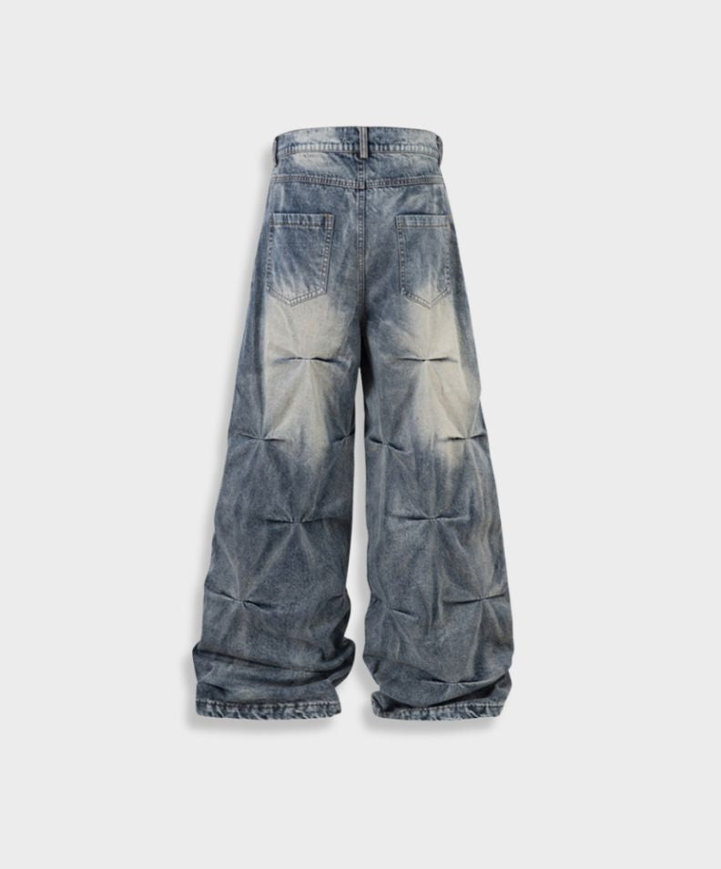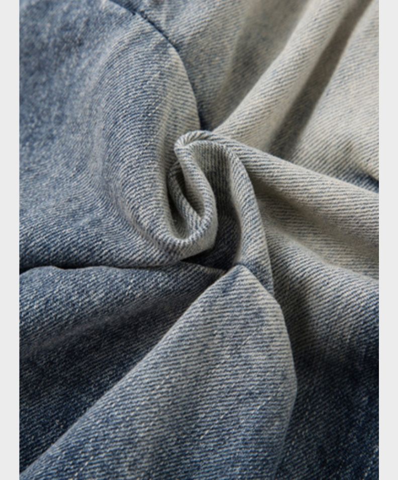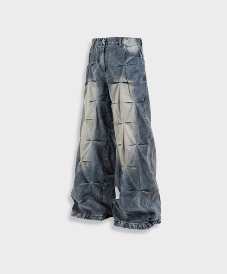 Denim délavé avec plis cousus pour une texture audacieuse.